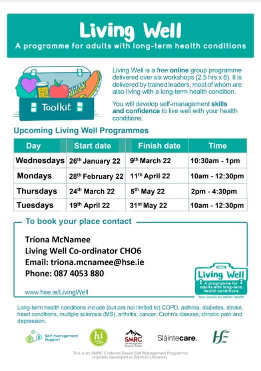 For more information about Living Well and to enrol contact Triona McNamee, Living Well Coordinator CH06 by email [email protected] or go to www.hse.ie/livingwell