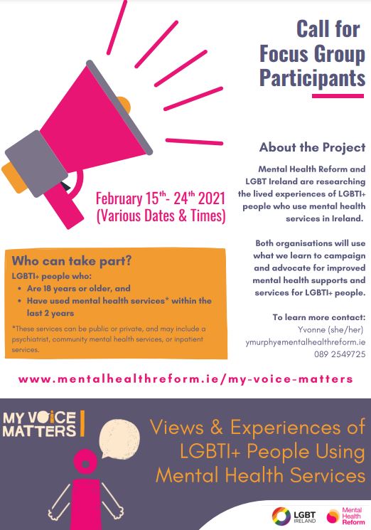 Mental Health Reform and LGBT Ireland are researching the lived experiences of LGBTI+ people who use mental health services in Ireland.