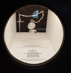 Story boards, artefacts, personal memorabilia and interactive touch screens display information on over 800 RMS Leinster casualties and survivors of this dreadful tragedy and the 36 man crew of UB-123. Beneath an impressive RMS Leinster scale model are a brass spittoon from the wreck and an inscribed silver pocket watch presented to Fireman William Maher by passenger Dorothy Toppin for saving her life. A large brass fire pump emphasises the scale of this 115 metre (377 feet) long ship capable of 24 knots speed. A triangular display portraying a riveted ships bow embedded with two RMS Leinster brass portholes shows the luxurious interiors of a first class cabin and dining room. Also displayed are medals, memorial cards, galley keys and a franked letter retrieved from the sea and subsequently delivered to the addressee in Canada.