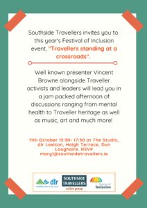 Southside Travellers invites you to this year’s Festival of Inclusion event, “Travellers standing at a crossroads”. Well known presenter Vincent Browne alongside Traveller activists and leaders will lead you in a jam packed afternoon of discussions ranging from mental health to Traveller heritage as well as music, art and much more!