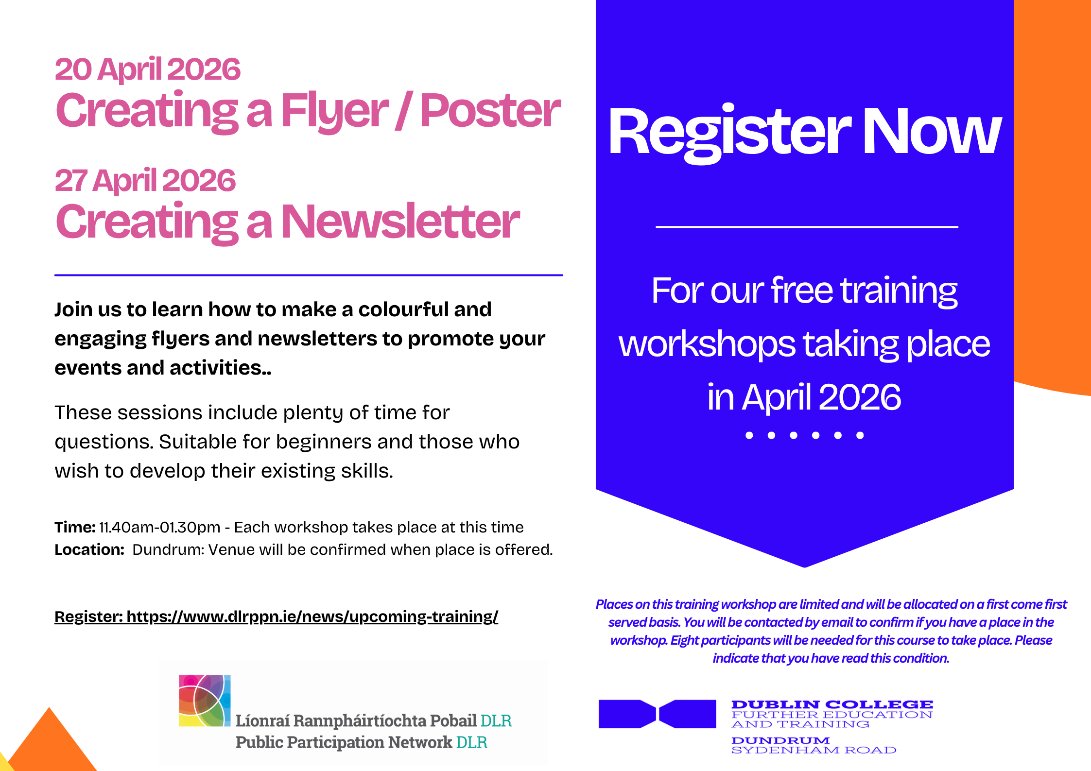 Date: 27 April 2026 Time: 11.40am - 1.30pm Location: DLR venue will be confirmed when a place is offered. Join us to learn how to make a colourful and engaging Newsletter […]