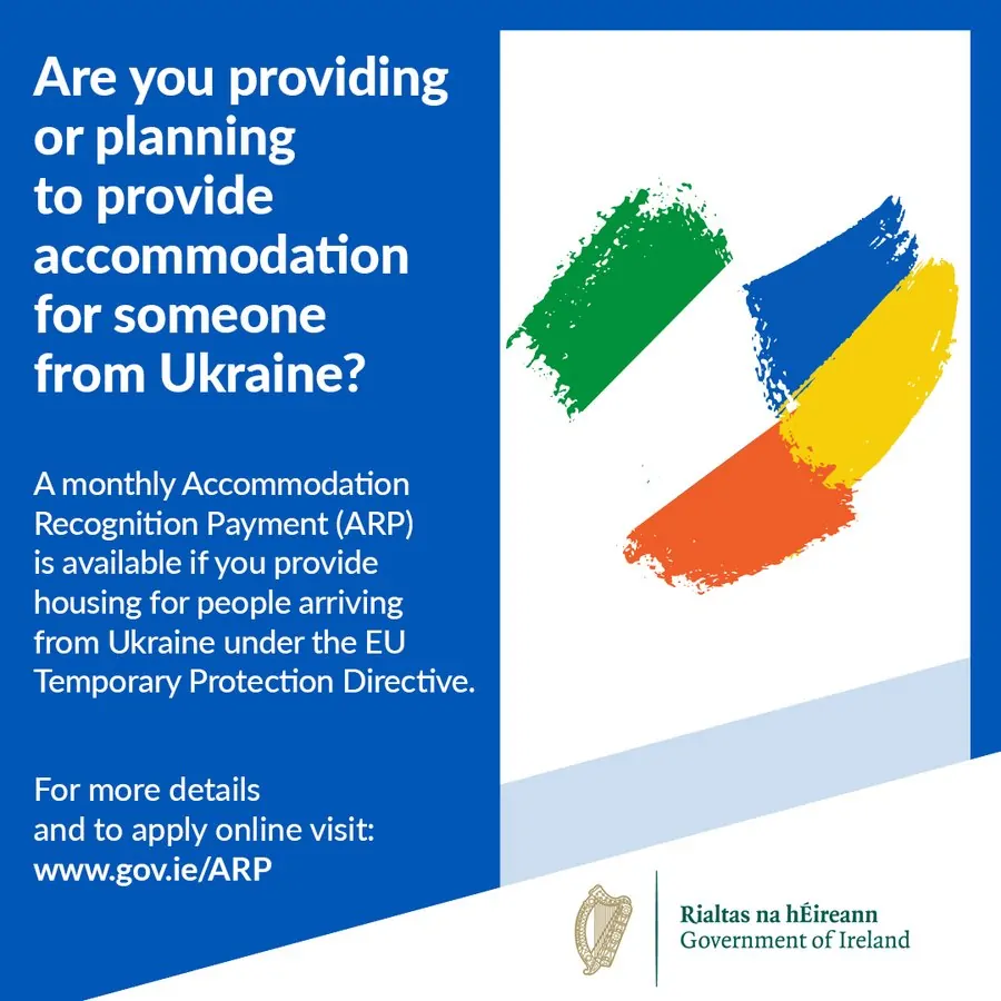 People across Ireland have opened their homes to provide temporary accommodation to people fleeing the conflict in Ukraine. In recognition of their generosity, the government is providing a monthly payment of €400 for each property. The Accommodation Recognition Payment is a scheme to pay a financial contribution for the hosting of Temporary Protection Beneficiaries from Ukraine, as provided in Part 2 of the Civil Law (Miscellaneous Provisions) Act 2022. As part of the scheme, a monthly payment of €400 is available to you if you are providing accommodation to a person or people who arrived in Ireland under the EU Temporary Protection Directive since March 2022.
