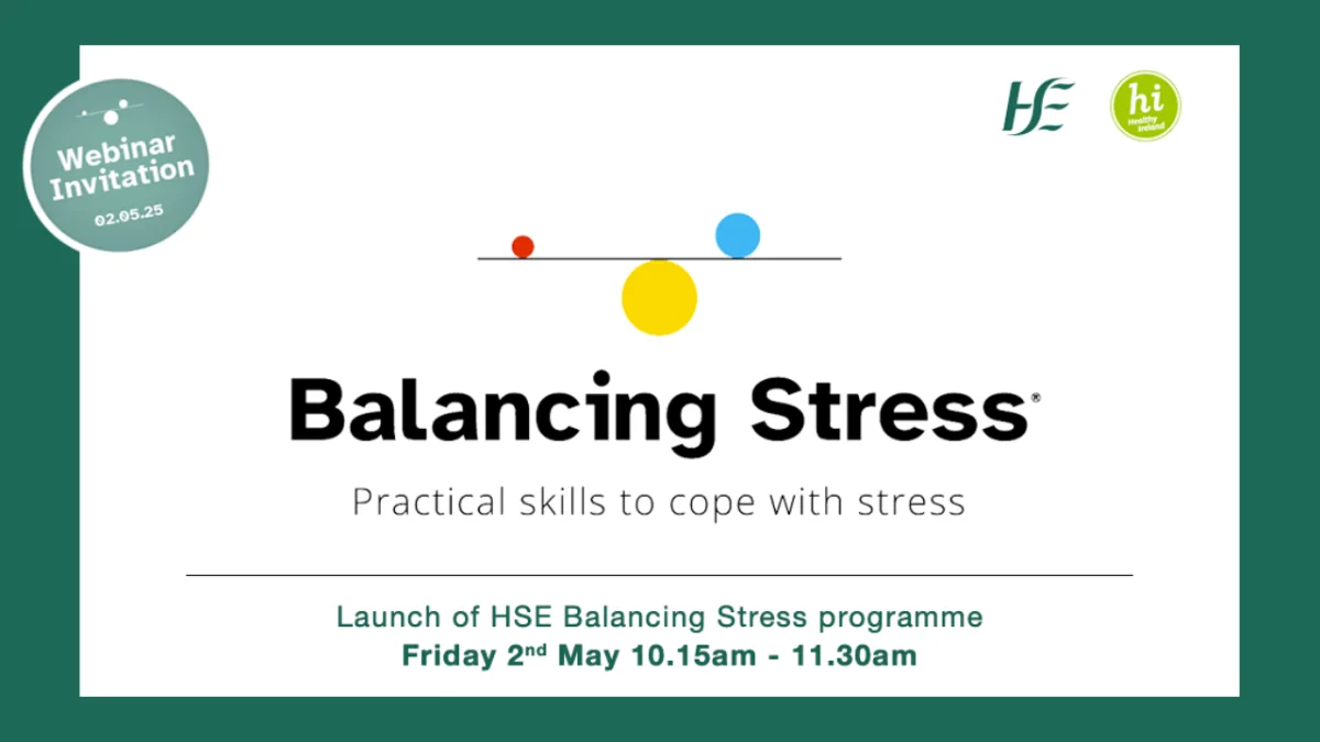The HSE are delighted to invite you to the official webinar launch of the HSE Balancing Stress Programme, which will be launched by Jennifer Murnane O’Connor TD, Minister of State for Public Health, Wellbeing and the National Drugs Strategy on Friday 2nd May at 10.15am – 11.30am. Register Here https://hse720p.webex.com/weblink/register/r7e490a7154fcfa605e43d0defdf5ee95