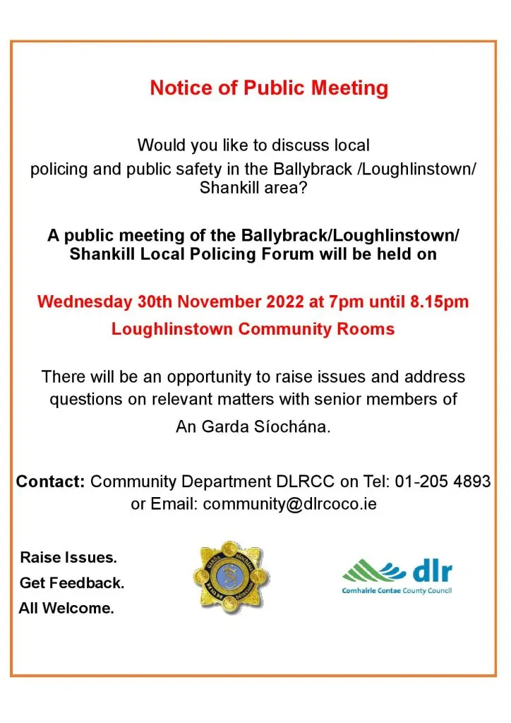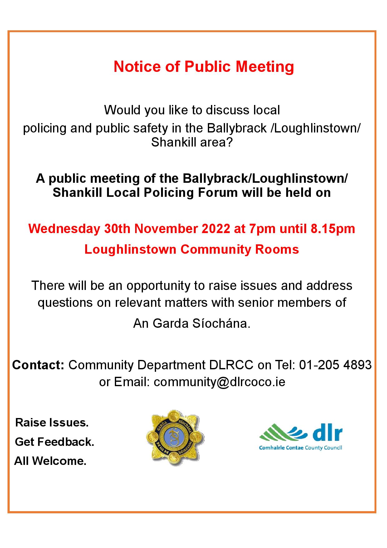 A Ballybrack/Loughlinstown/Shankill Local Policing Forum public meeting will be held on Wednesday, 30th November 2022 at Loughlinstown Community Rooms to discuss local policing and public safety in the area.