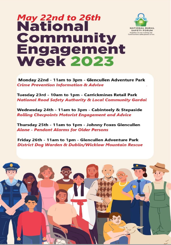 The DMR East Division of an Garda Siochána will be conducting a series of  talks and pop-up stands for the National Community Engagement Week running from May 22nd 2023 to May 26th 2023, both dates inclusive.