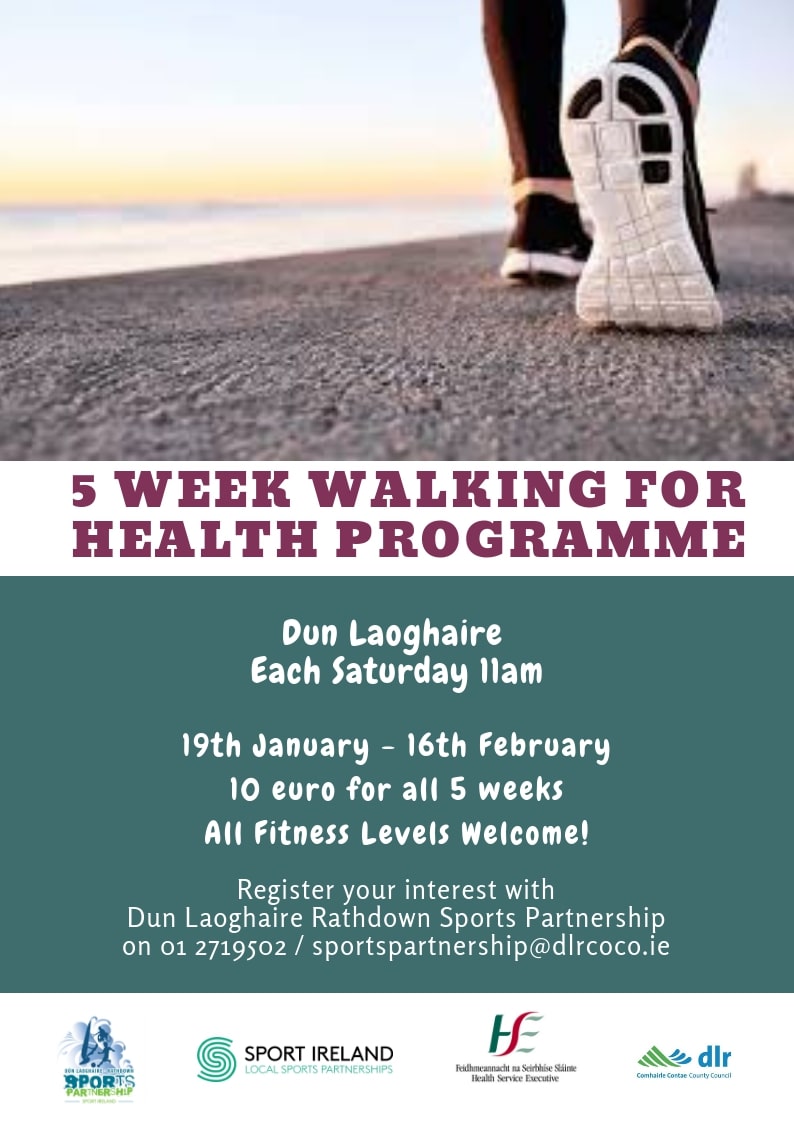 Dún Laoghaire-Rathdown Sports Partnership are also running a 5 week walking for health programme starting on the 19th of January at 11am in Dun Laoghaire. Suitable for all ages and fitness levels, costing €10 for all 5 weeks.