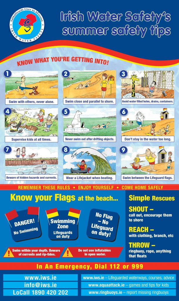“With the good weather and high temperatures forecast to last right through to the weekend, we want to remind everyone to attend to their personal safety. With so many people enjoying the water this summer, it’s important that we all know the risks. The sea can be unpredictable, and even with the temperatures soaring, the fact is that the water is still relatively cool compared to air temperatures. Just because an area looks safe for swimming it doesn’t mean that it is safe. Only swim in areas that are protected by lifeguards or in areas with which you are familiar. In the case of lifeguard protected beaches only swim between the red and yellow flags”