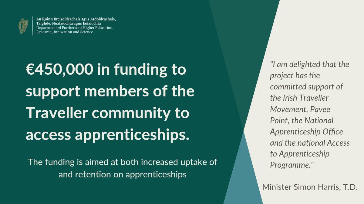 The funding will be used for a 1-year pilot Traveller Apprenticeship Incentivisation Programme, which is aimed at both increased uptake of apprenticeships and retention of apprenticeships.
