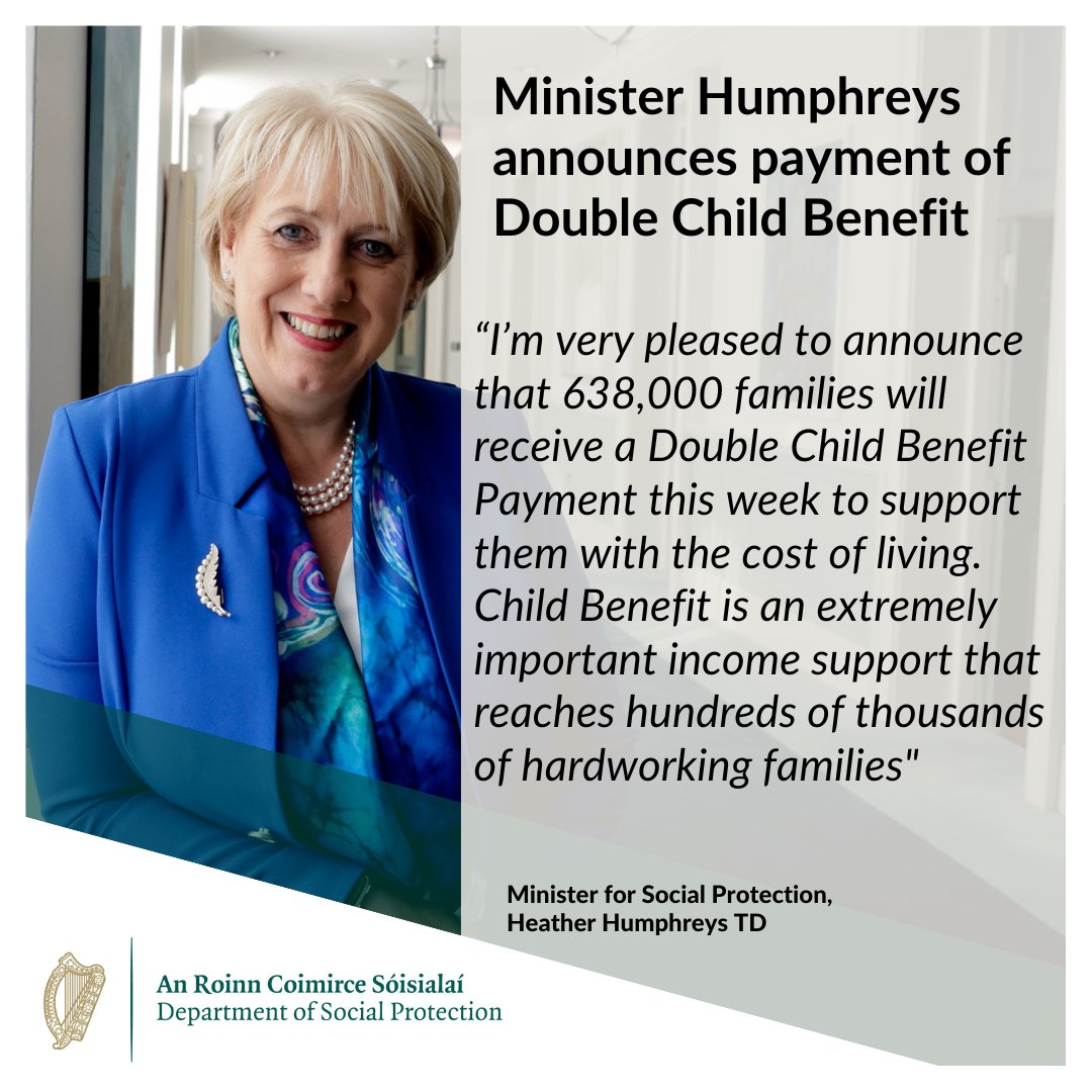 “I’m very pleased to announce that 638,000 families will receive a Double Child Benefit Payment this week to support them with the cost of living. This means that €280 will be paid in respect of 1.2 million children across the State.
