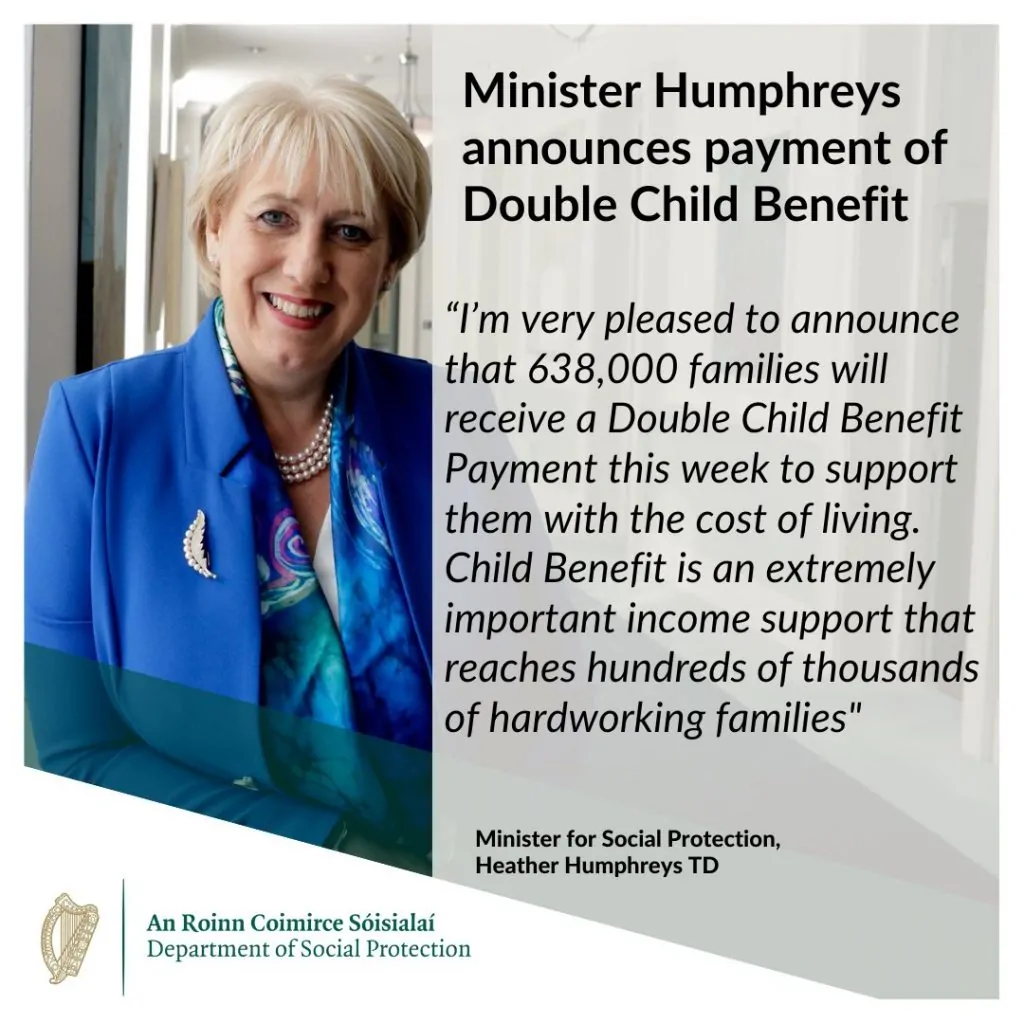 The Minister for Social Protection, Heather Humphreys TD, has announced that a Double Child Benefit Payment will be paid this week to support 638,000 families with the Cost of Living. Child Benefit is a monthly payment of €140 for each child. It is made to families with children in respect of all qualified children up to the age of 16 years. The payment for November is being doubled to €280 for each child.