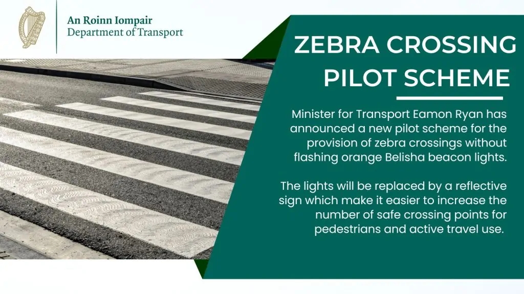 Minister for Transport Eamon Ryan on Monday 24 October 2022 announced a pilot scheme for the provision of zebra crossings without the flashing orange Belisha beacon lights.