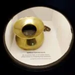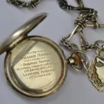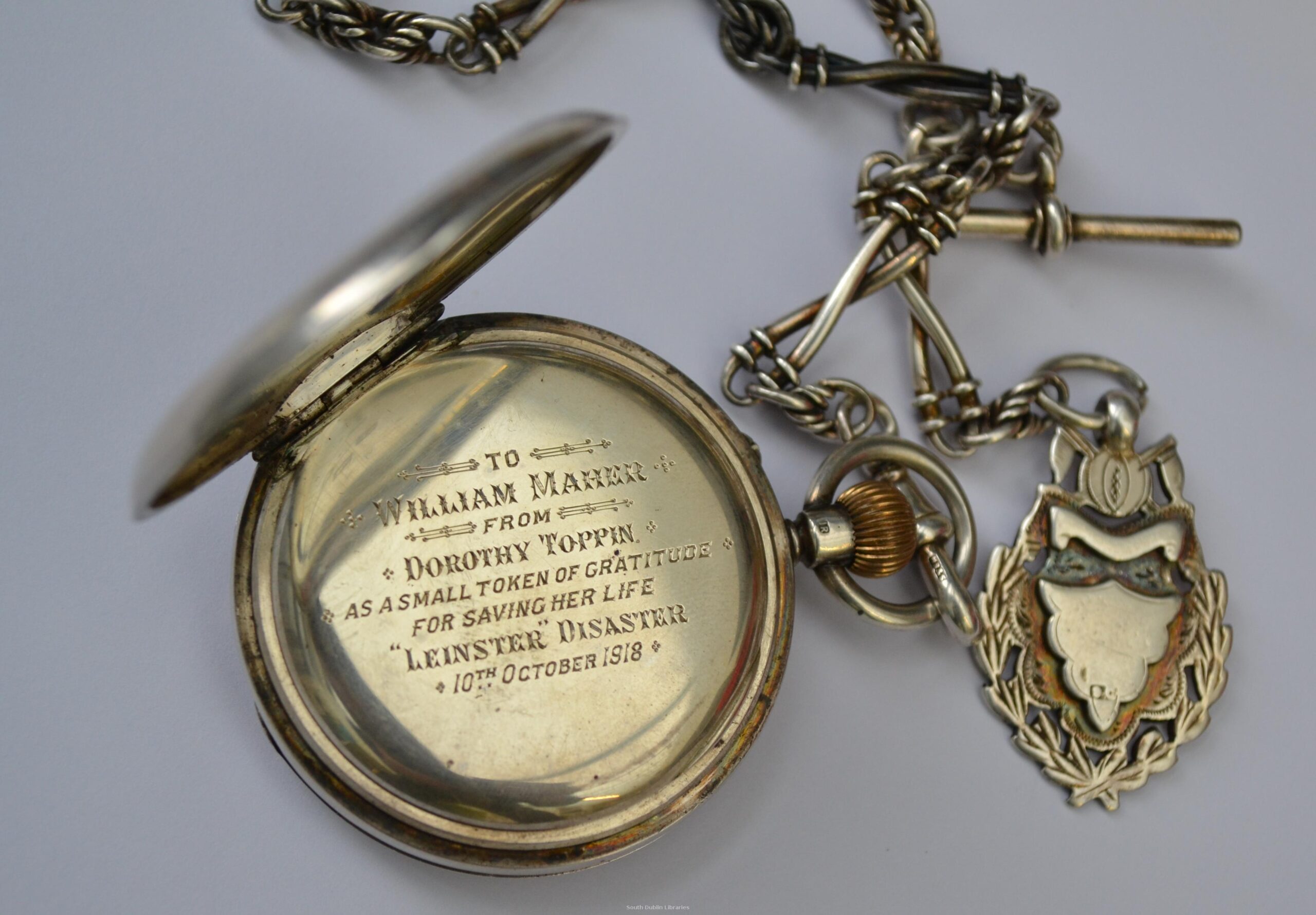 Story boards, artefacts, personal memorabilia and interactive touch screens display information on over 800 RMS Leinster casualties and survivors of this dreadful tragedy and the 36 man crew of UB-123. Beneath an impressive RMS Leinster scale model are a brass spittoon from the wreck and an inscribed silver pocket watch presented to Fireman William Maher by passenger Dorothy Toppin for saving her life. A large brass fire pump emphasises the scale of this 115 metre (377 feet) long ship capable of 24 knots speed. A triangular display portraying a riveted ships bow embedded with two RMS Leinster brass portholes shows the luxurious interiors of a first class cabin and dining room. Also displayed are medals, memorial cards, galley keys and a franked letter retrieved from the sea and subsequently delivered to the addressee in Canada.