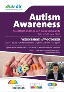 Talks from AsIAm and Prism on Autism Awareness and acceptance and inclusion in our community. Wednesday 10th October, 7.30pm County Hall, Marine Road, Dun Laoghaire, as part of the Festival of Inclusion.