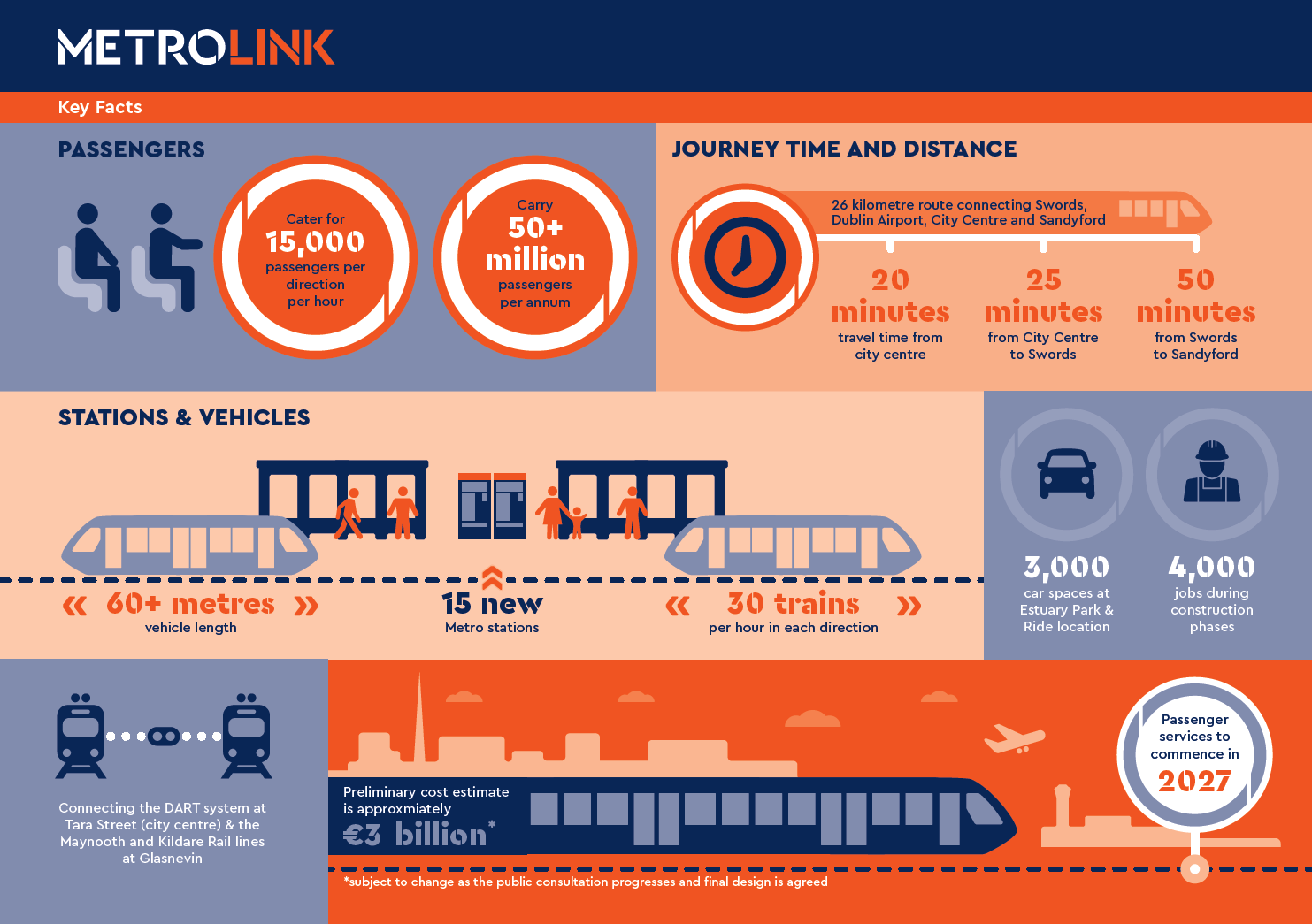 There will be a total of 25 stations (including 15 new stations), 3,000 additional Park and Ride spaces, and a journey time of approximately 50 minutes from Swords to Sandyford.
