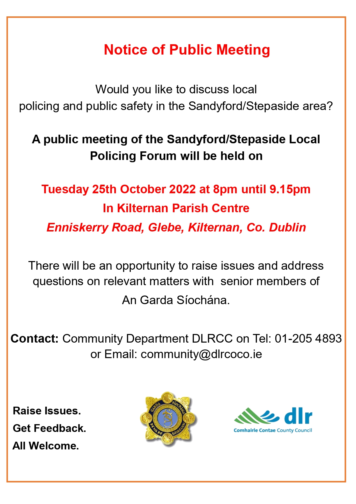 There will be a Sandyford/Stepaside Local Policing Forum public meeting coming up on 25th October 2022 to discuss local policing and public safety in the Sandyford/Stepaside area.