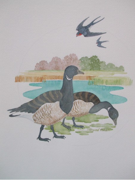 Pale Bellied Brent Geese from the Canadian Arctic and Swallows from sub-Sahara Africa Watercolour by V.Heywood