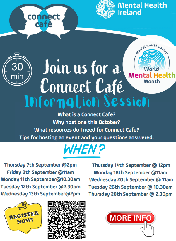 CONNECT CAFE INFORMATION SESSIONS online 26th of September – 10.30am to 11.30am 28th September – 14.30pm – 15.30pm   Mental Health Ireland is inviting you to an information session for […]