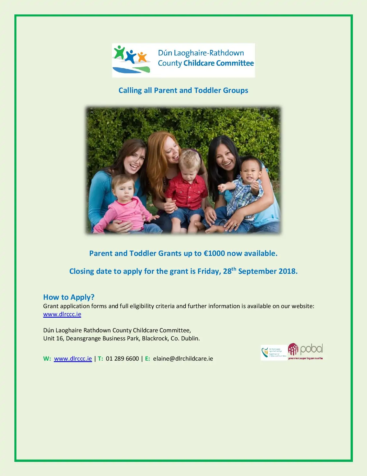 Applications for funding under this scheme should only be made by Parent & Toddler Groups that are organised on a not for profit basis and involve the participation of parents […]