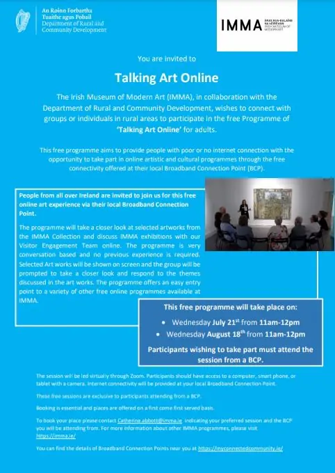 The Irish Museum of Modern Art (IMMA), in collaboration with the Department of Rural and Community Development, wishes to connect with groups or individuals in rural areas to participate in the free Programme of ‘Talking Art Online’ for adults.