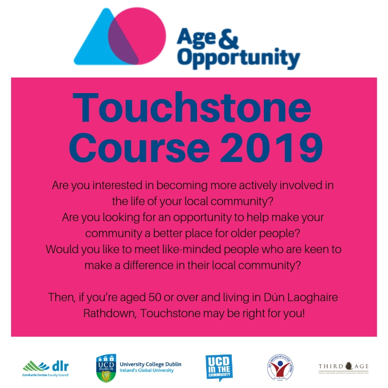 If you are interested in joining the Touchstone course, please contact Fiona Holohan at Age & [email protected] 01 8057798 Places on the course are limited and will be allocated on a first come-first served basis. Early application is strongly advised.